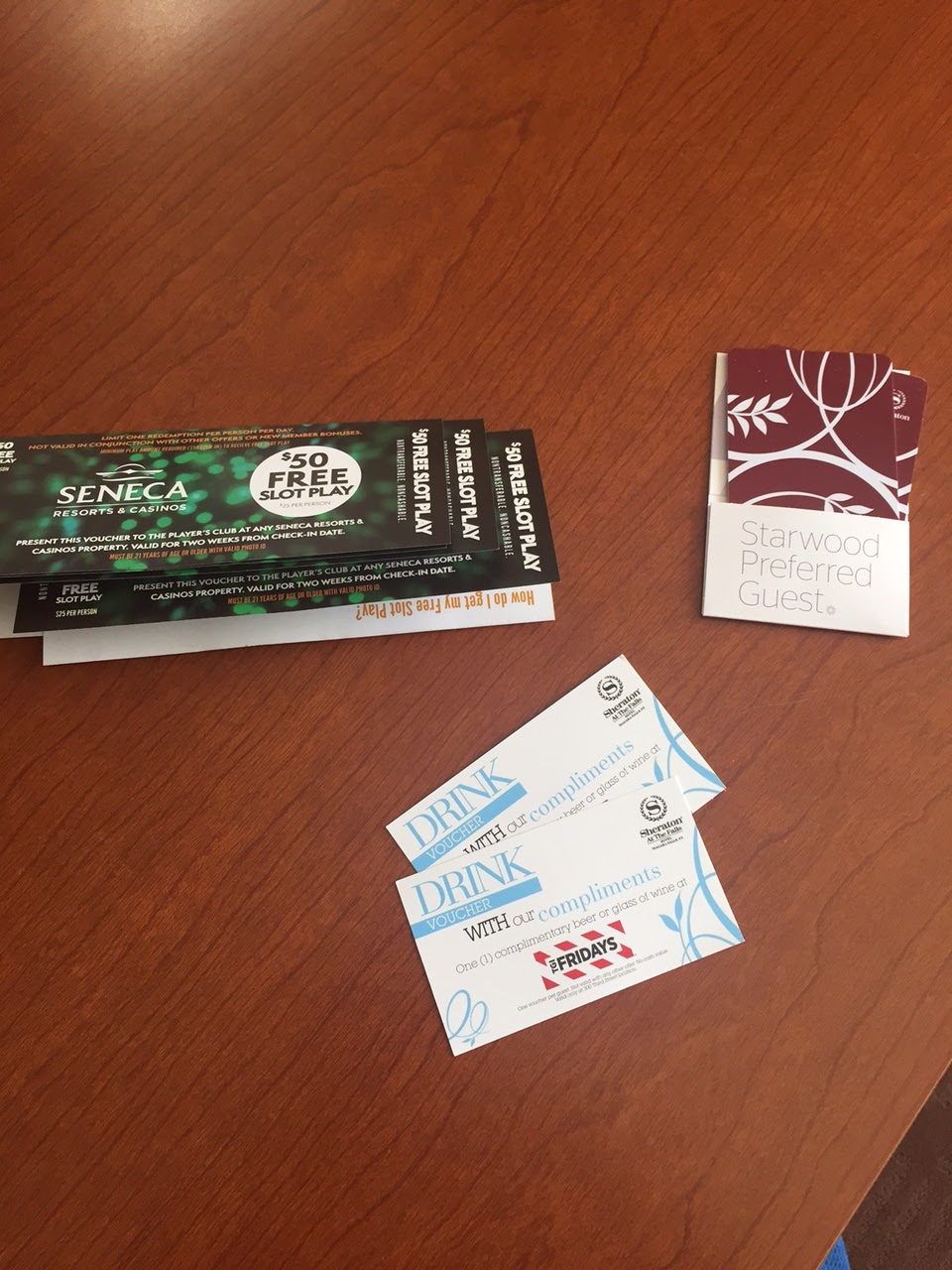 Sheraton is part of the SPG alliance, I don't have much status with them but I got treated like a king at this hotel. As I always stress in my post, If you don't ask you don't get! When I checked in I politely asked the front desk agent if the executive lounge was included in my reservation. I might have told her a little lie and said that they usually accommodate me on the top floor and give me access. She took a look at my reservation and said "sure I think we can take care of that for you". On top of giving me a room on the top floor and access to the lounge she gave me 2 drink coupons for the hotel bar, as well as some casino match play coupons for the Seneca Casino across the street.